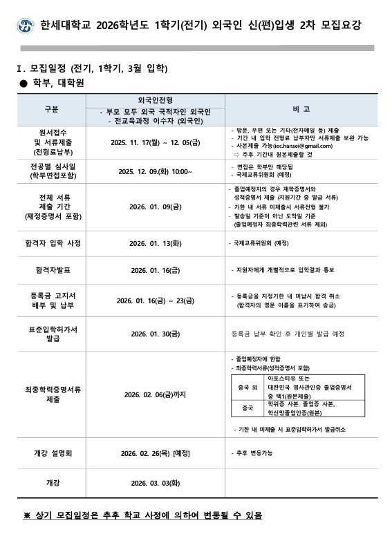 2026학년도 1학기(전기) 외국인 특별전형 신(편)입생 2차 모집 안내